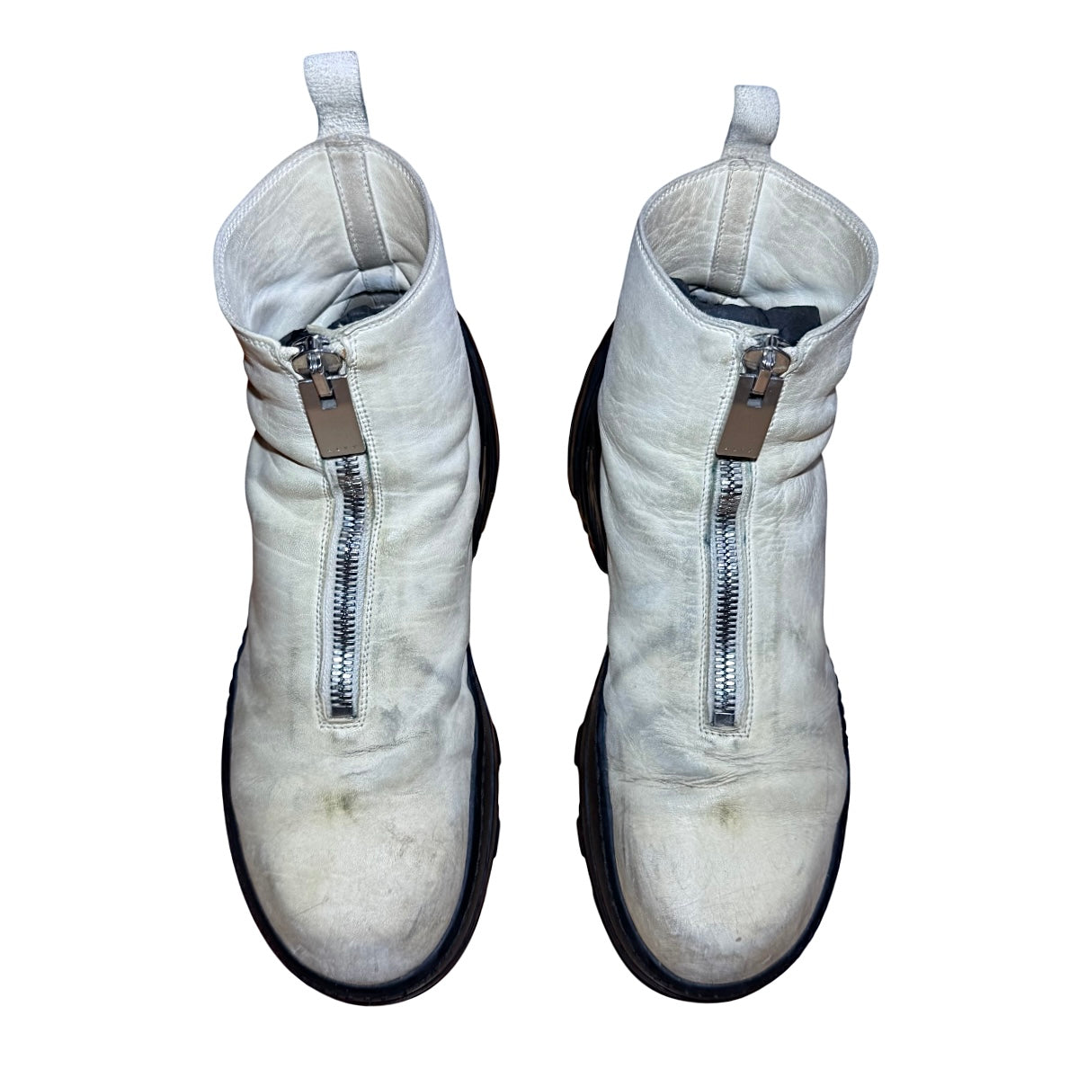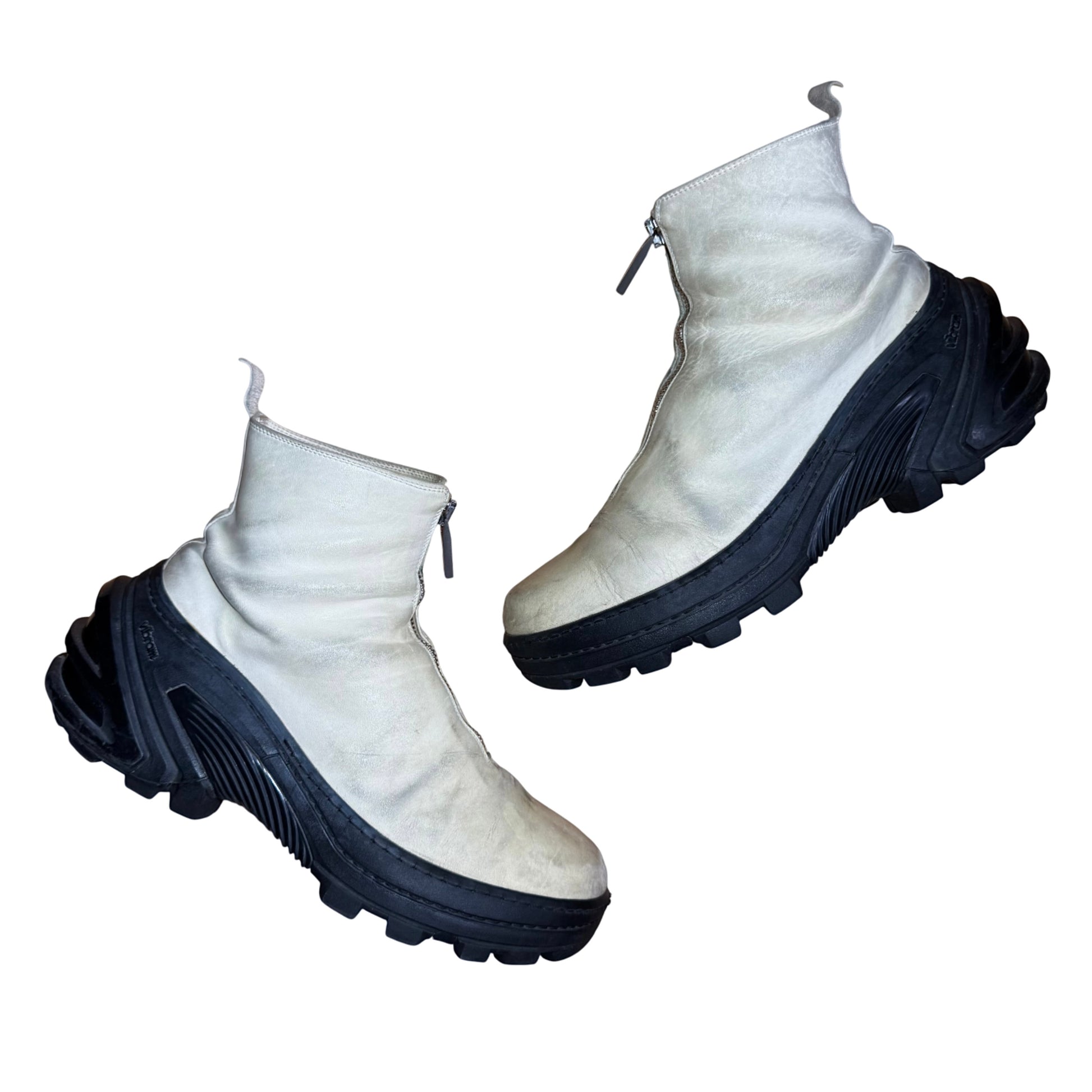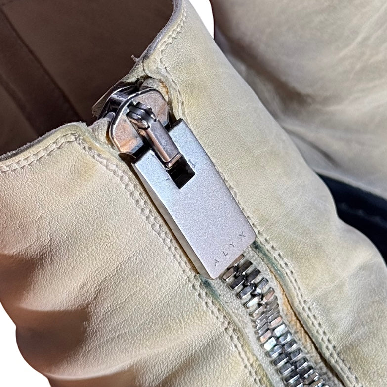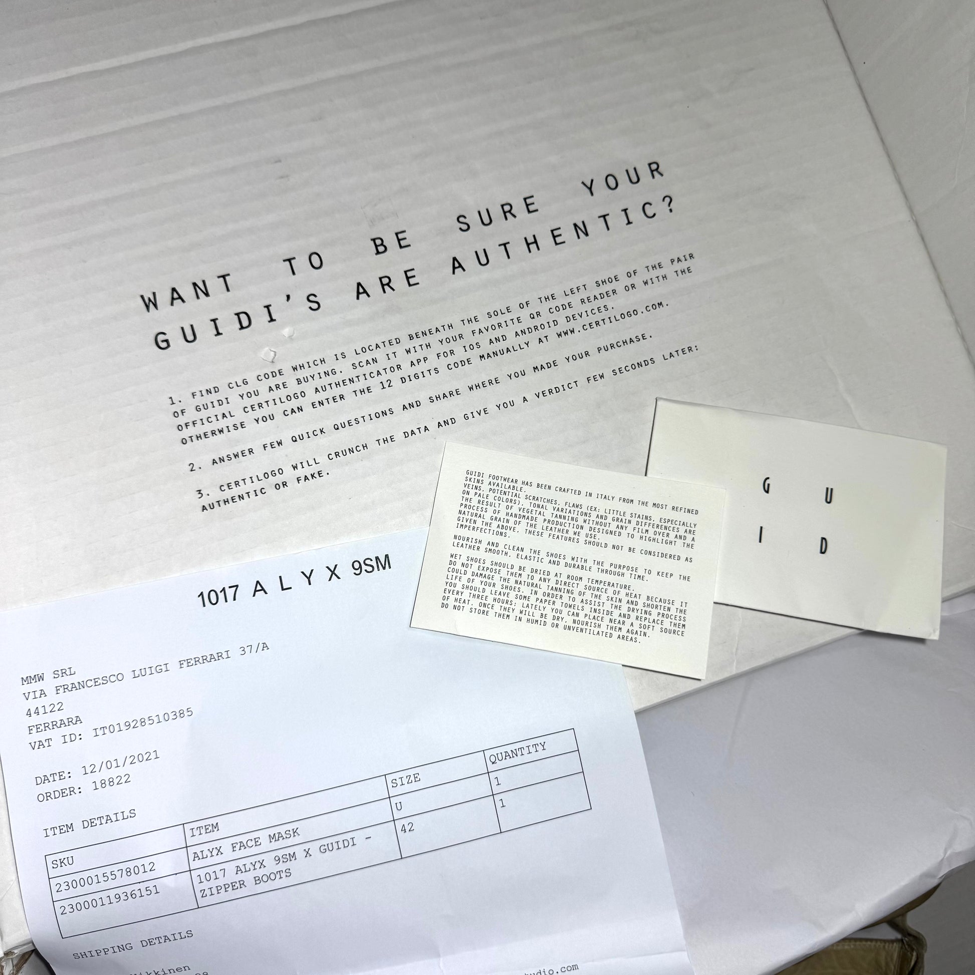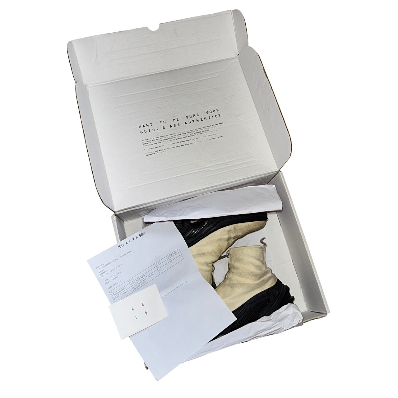 Your 2020 grail is here, the ALYX x GUIDI boots. These chunky boots features horse leather upper, the signature ALYX rubber Vibram sole and a front zip embossed with an ALYX inscription. The boots are handmade in Italy, crafted from tumble dyed vegetable tanned leather to produce a distinct finish that is unique to each individual pair. Over time the colours will change and distort. transmitting the feeling of possessing a unique object in continuous evolution. Comes with original packaging, care tag and order confirmation.