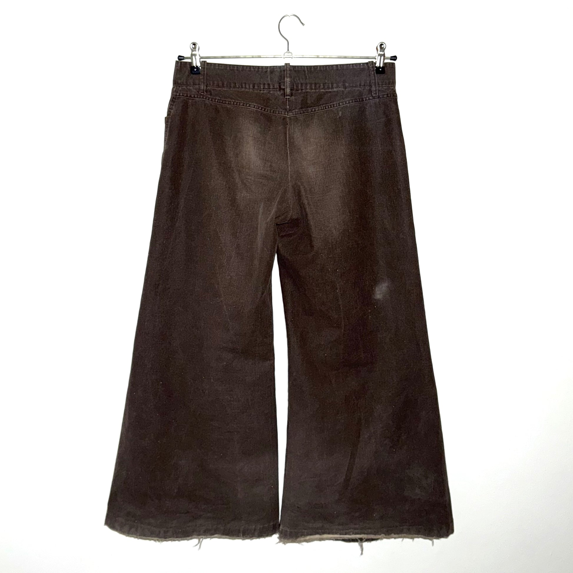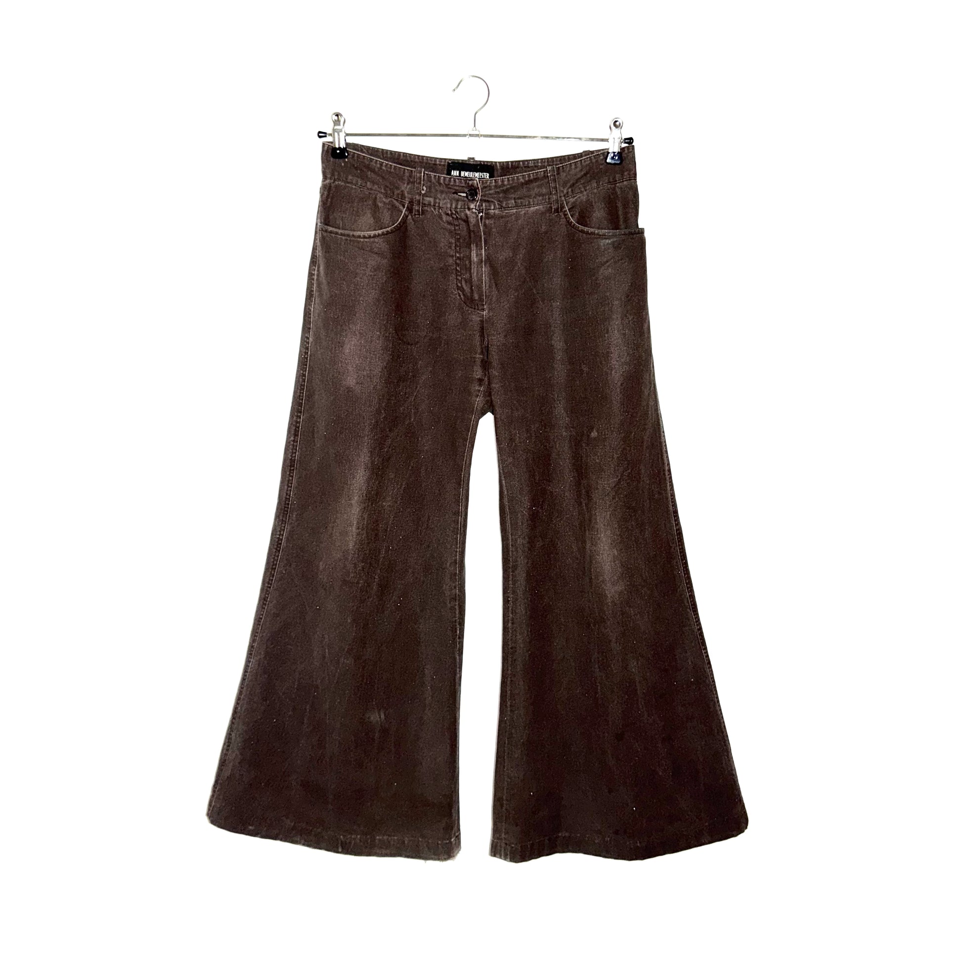 Wide-leg pants in dark chocolate brown from Ann Demeulemeester, features extra wide leg opening with a slight flare. 100% cotton with glitter-ish finish.