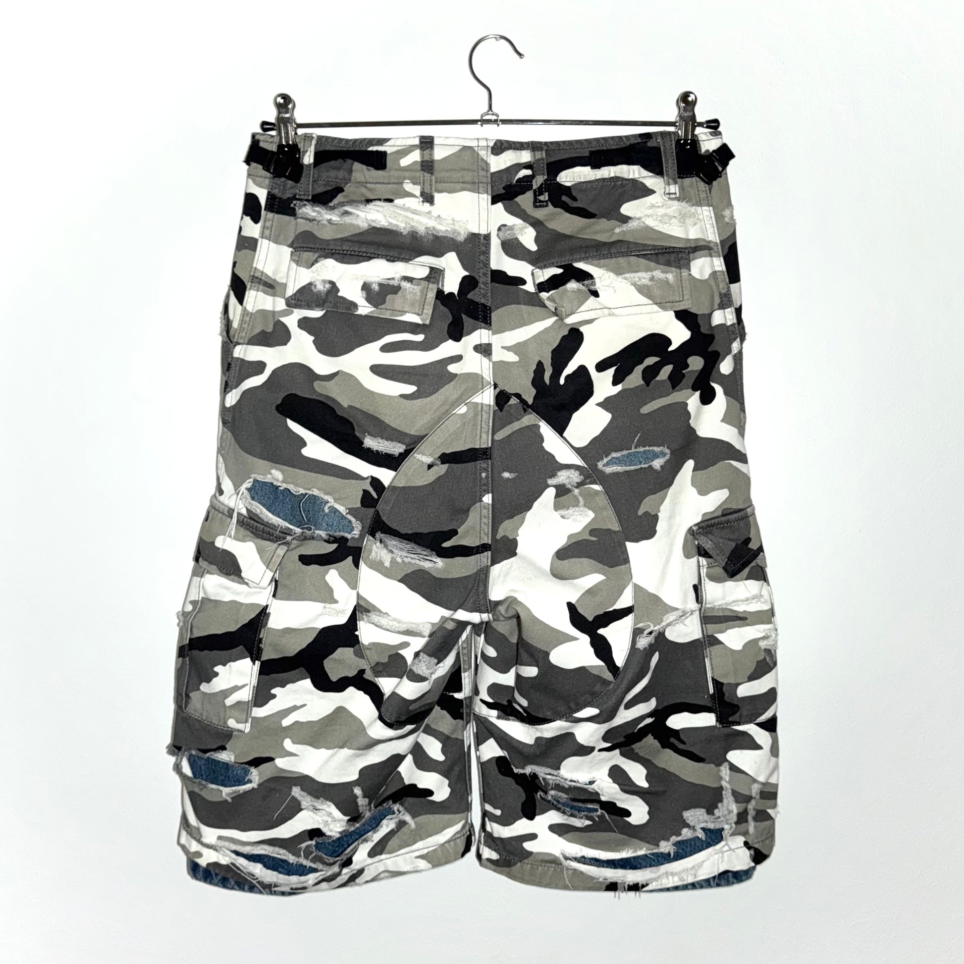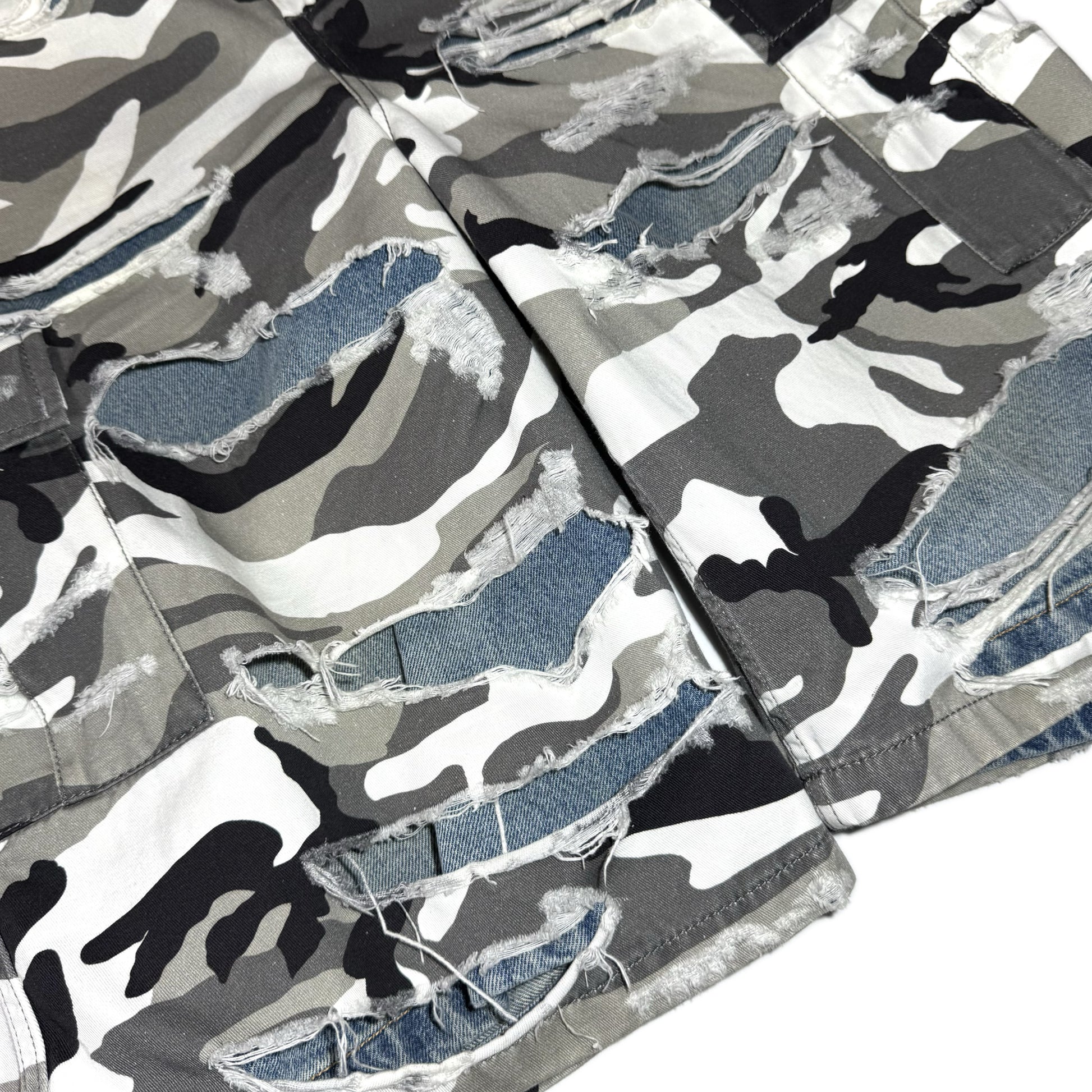 Beautiful snowcamo cargo shorts layered with blue denim jorts underneath. Total of four pockets and intentional distressing throughout, fan favorite piece from the FW21 "Afterworld" collection
