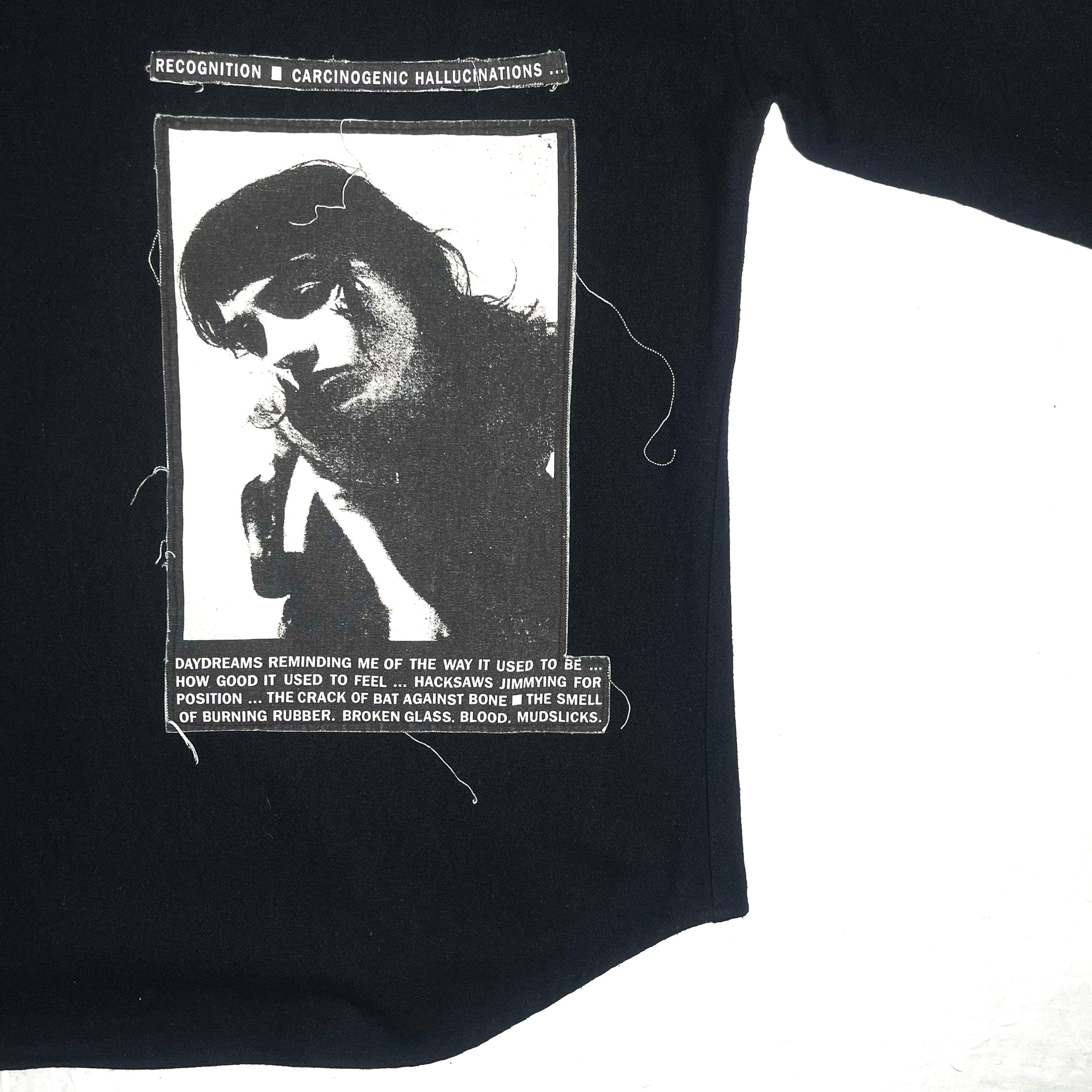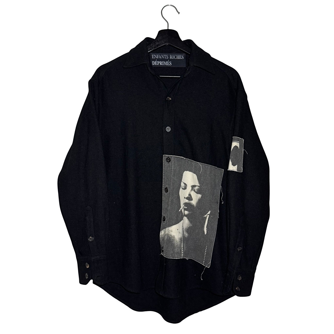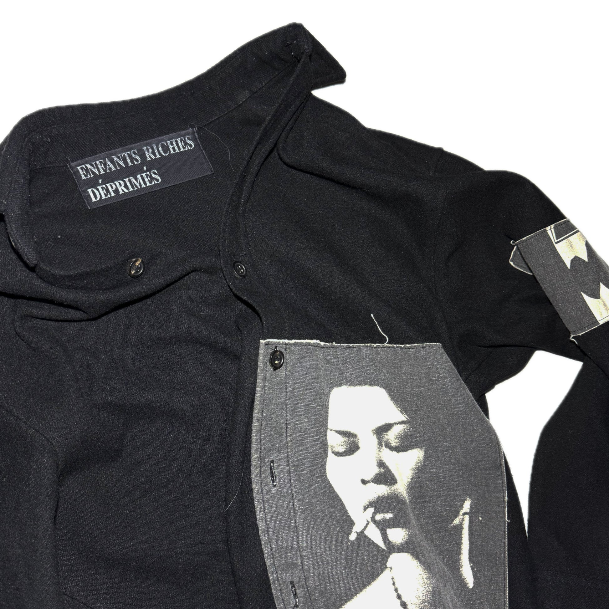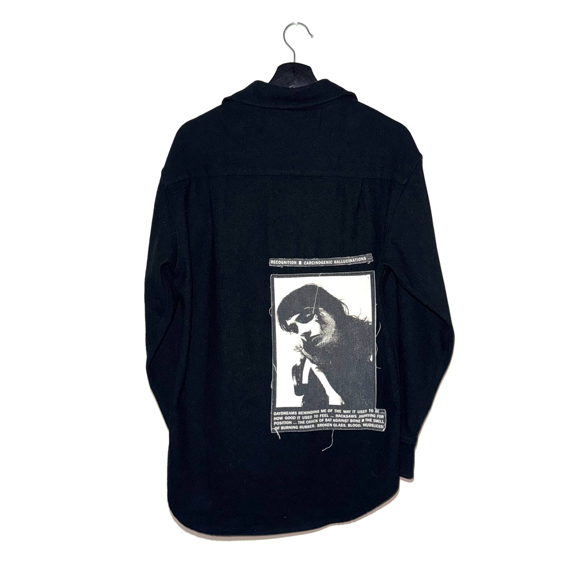 Wool button-up shirt with graphic printed patches both sides and the sleeve. From the early years of ERD by Henri.