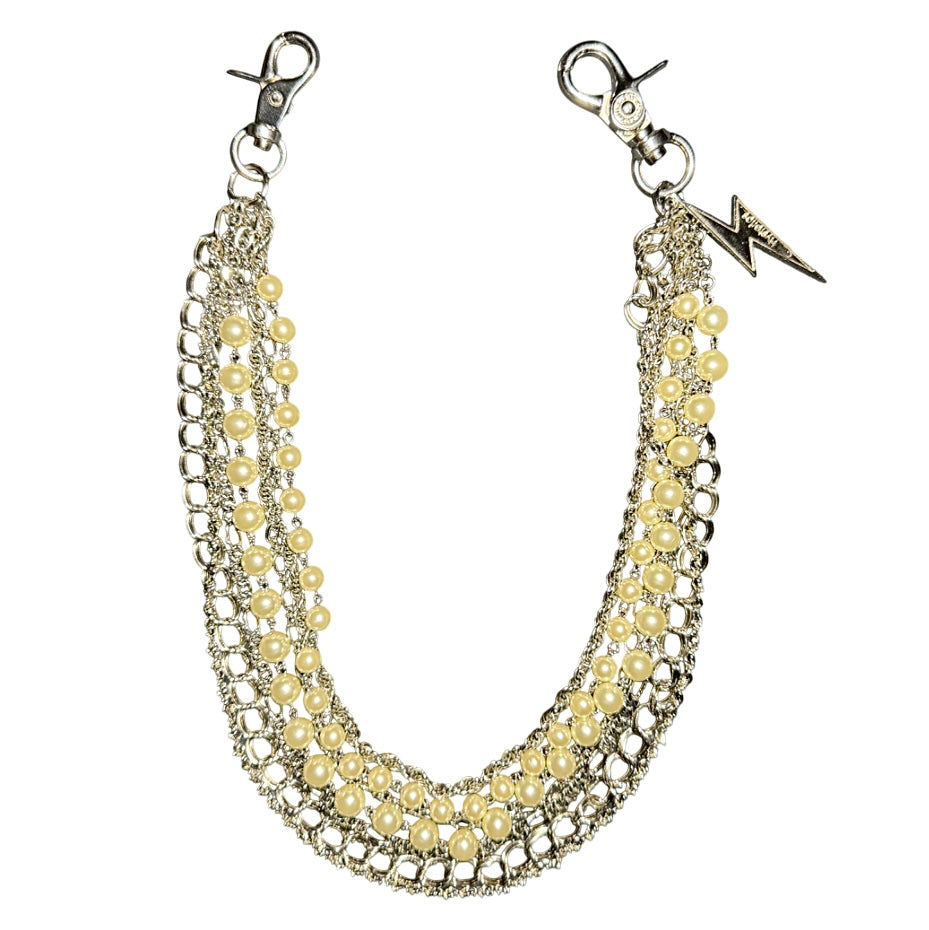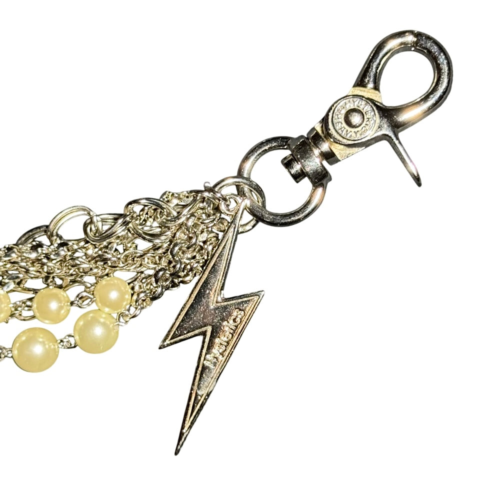 Gorgeous wallet chain combined of six different type of links as well branded lobster clasps, embellished with pearls and engraved lightning pendant. True eye-catcher.