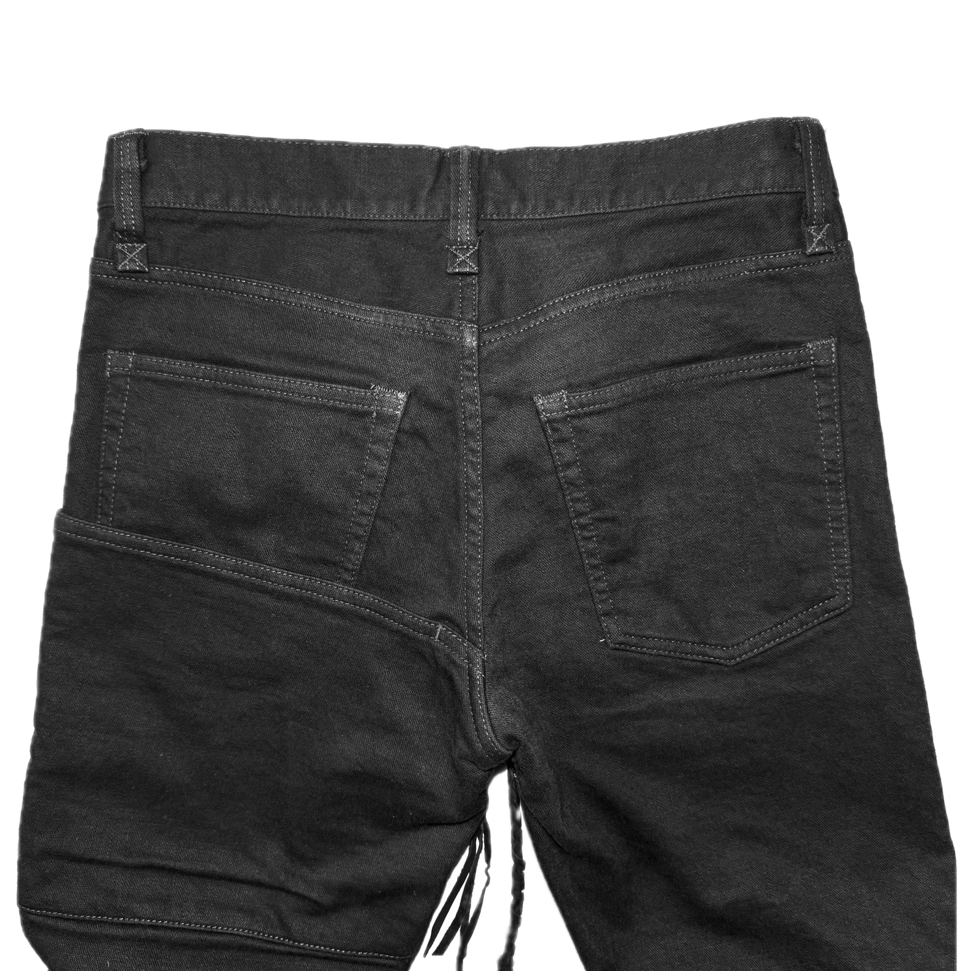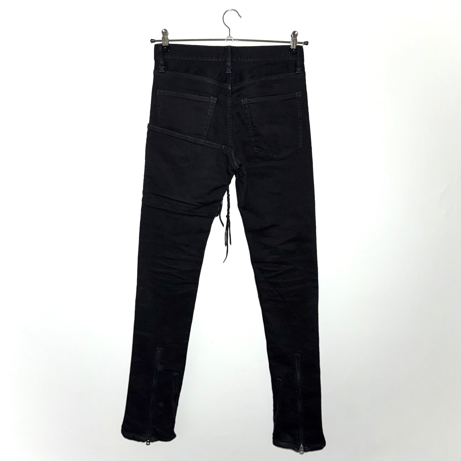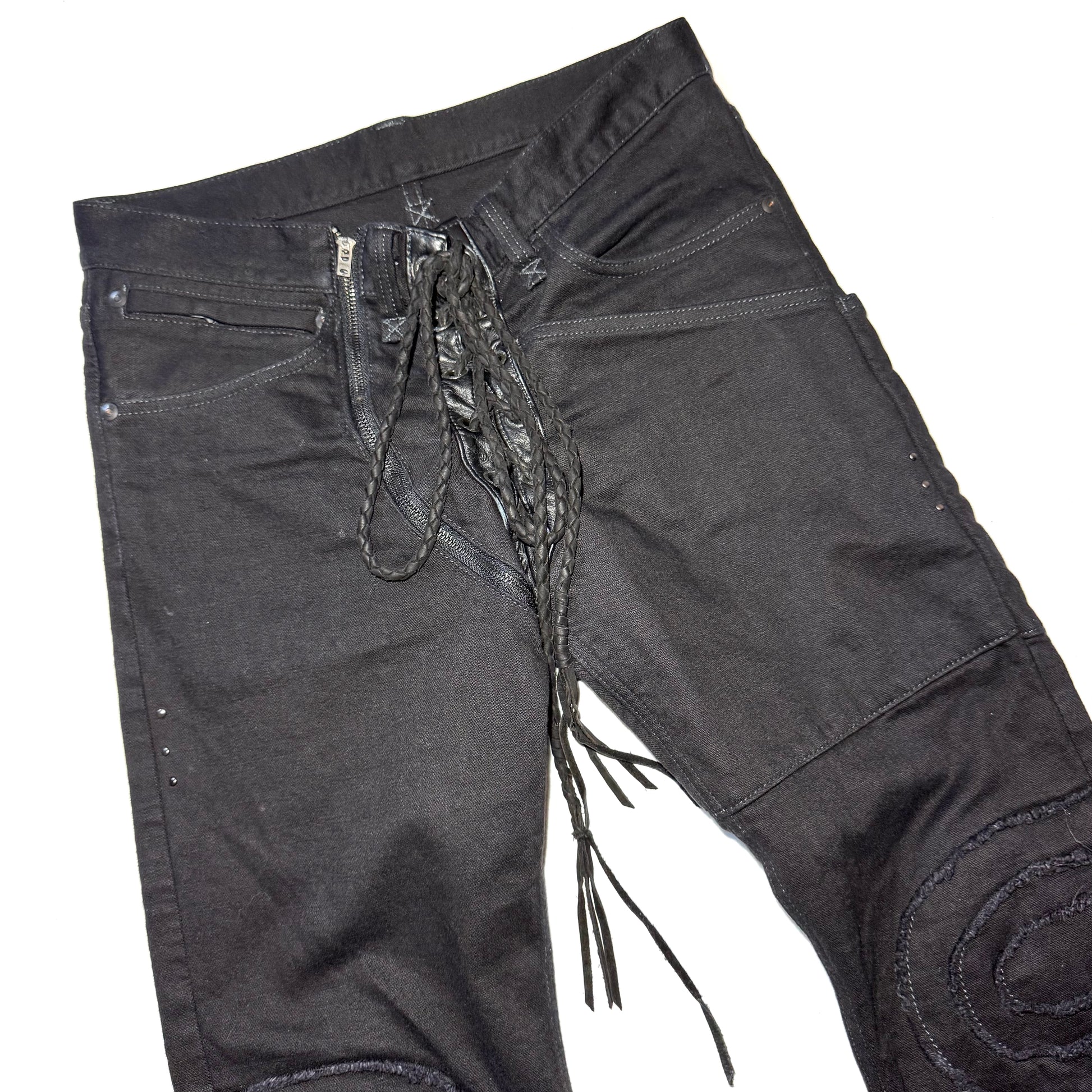 Features front lace-up closure with zipper, stud and knee details, expandable flare with zippers and total of six pockets. 95% cotton, 5% polyutharine. Leather: cow.