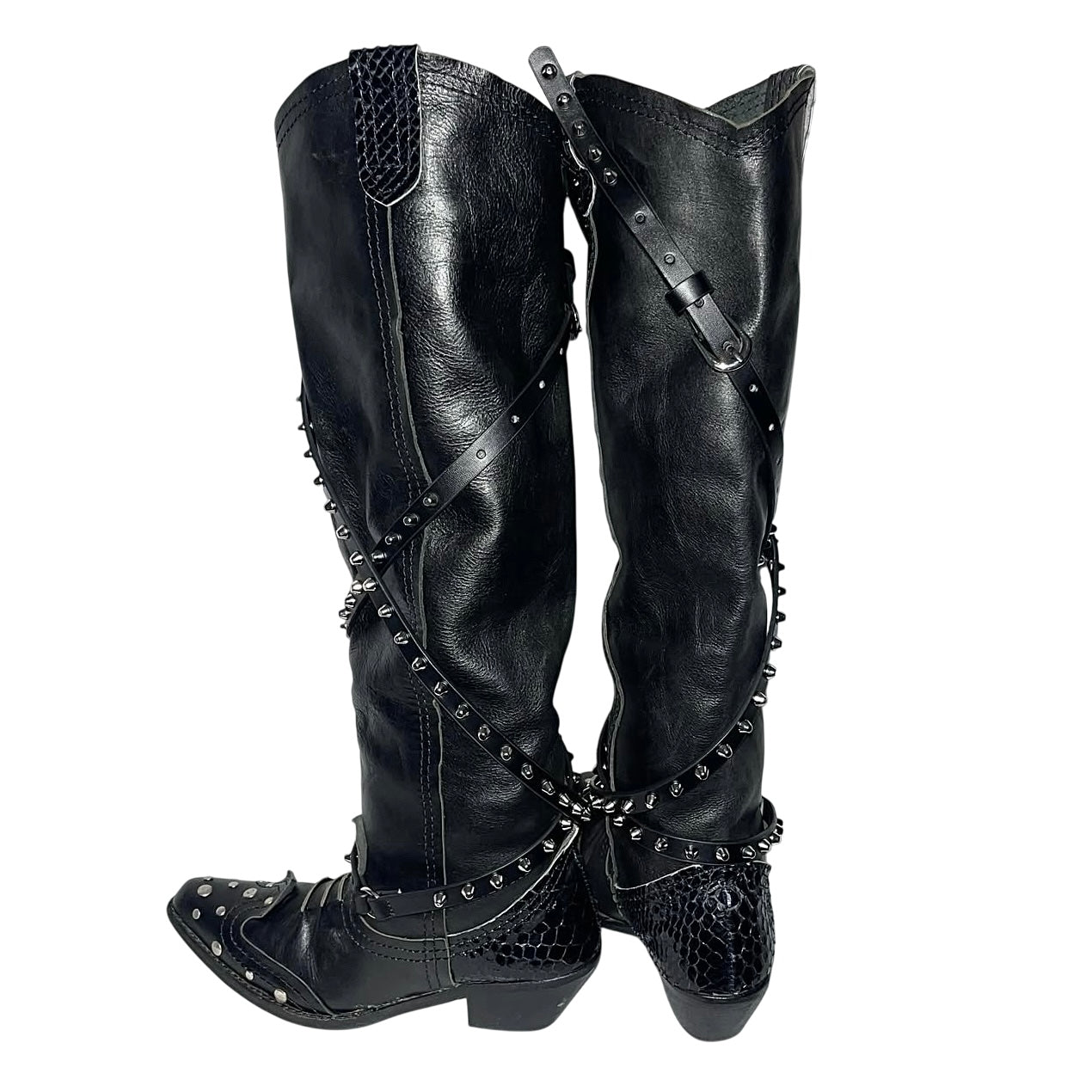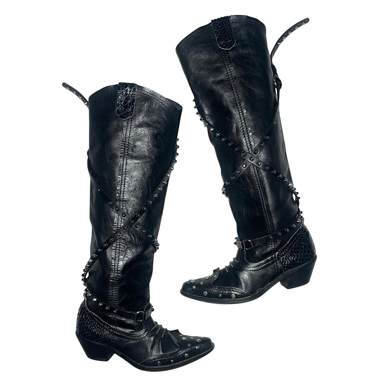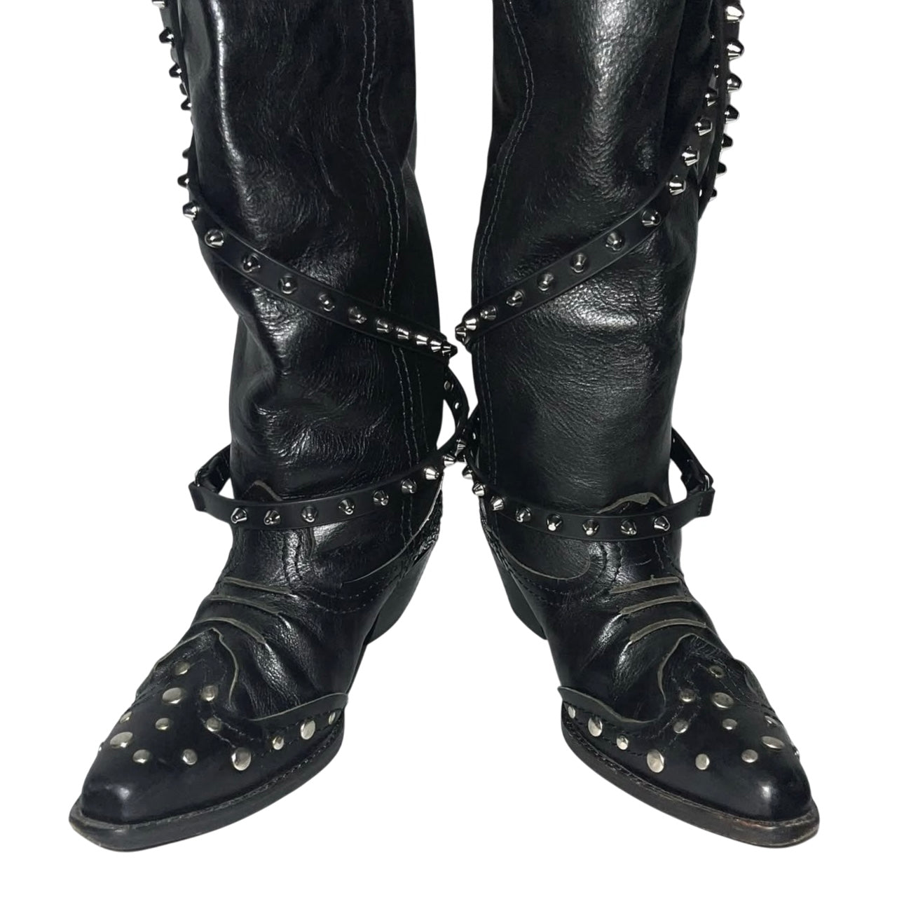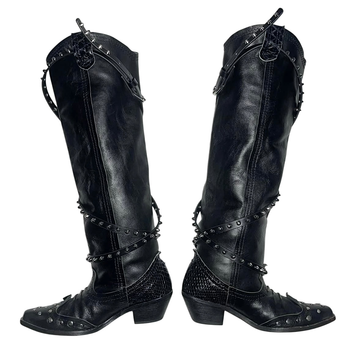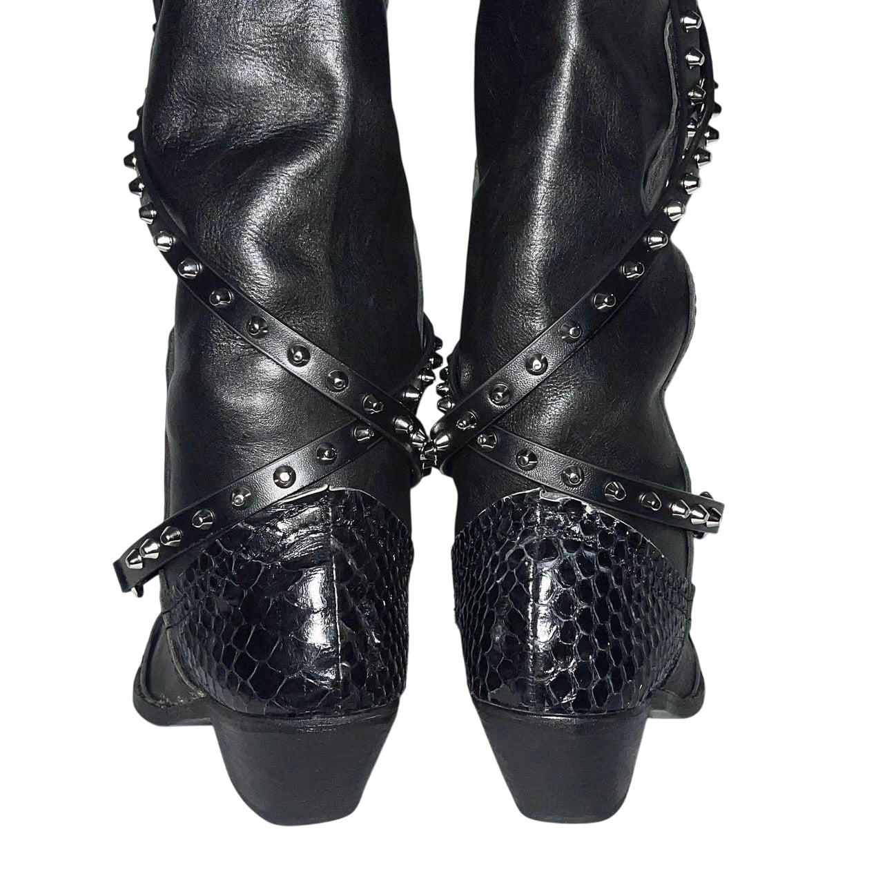 Extremely rare knee-high version of the FW06 studded boots. Featuring studs throughout, faux snakeskin details and detachable studded leather straps for each shoe, can be styled various ways.