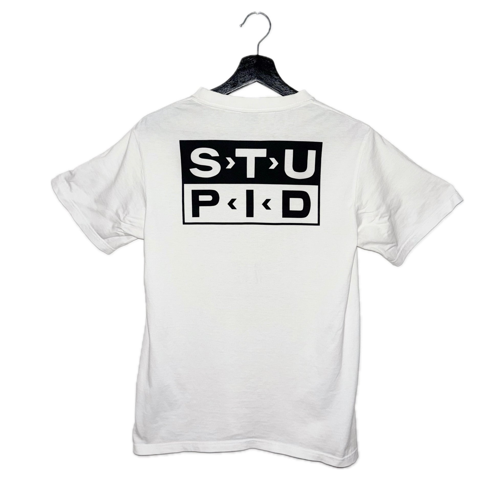 Tee from Takahiro Miyashitas SS06 collection features black script quote printed on the front, speaking of the duality between one's hopes and their harsh reality. Classic "STUPID" print on the back, referring to classic rock insignia. Air vents on the armpits to prevent sweating and the classic note print going around the collar.