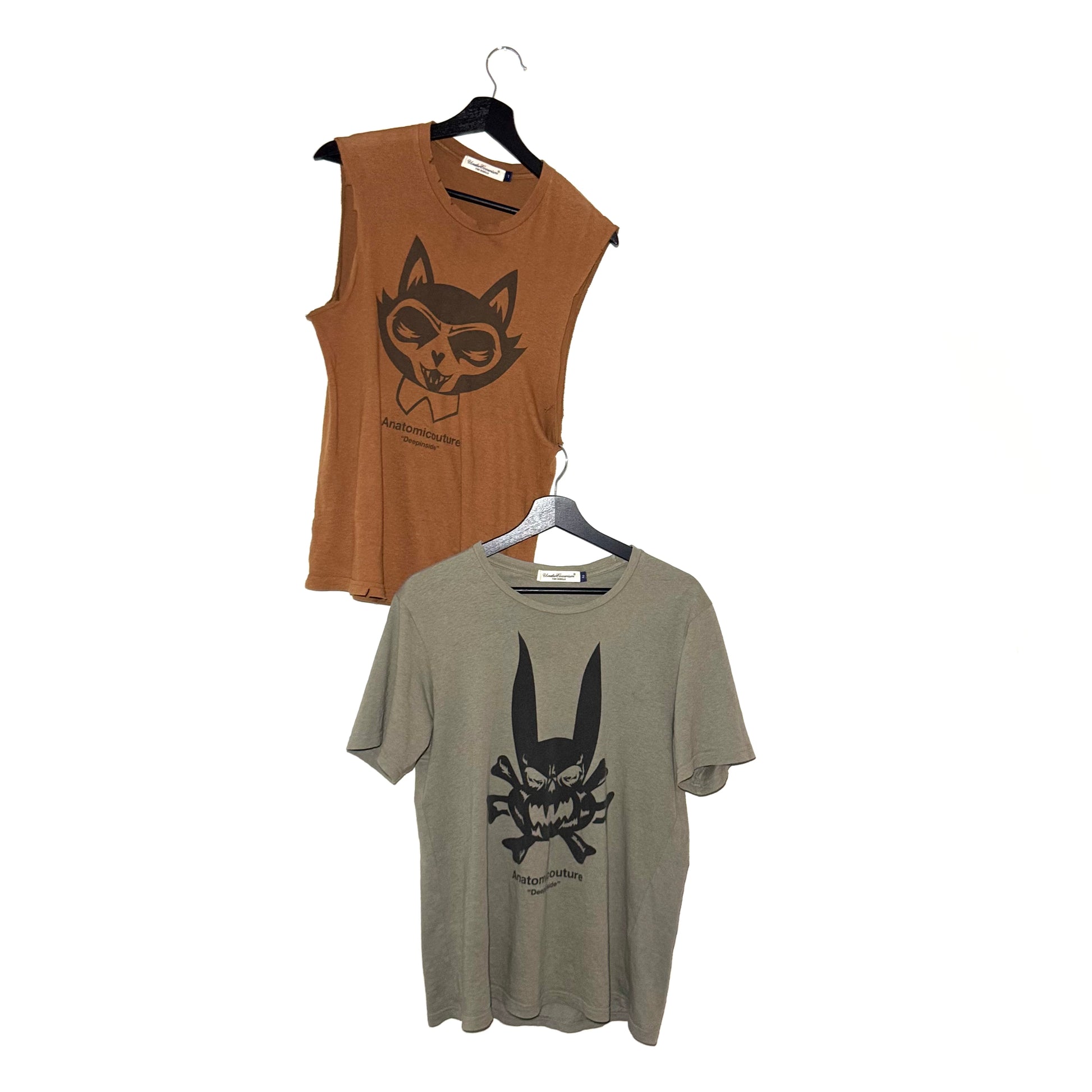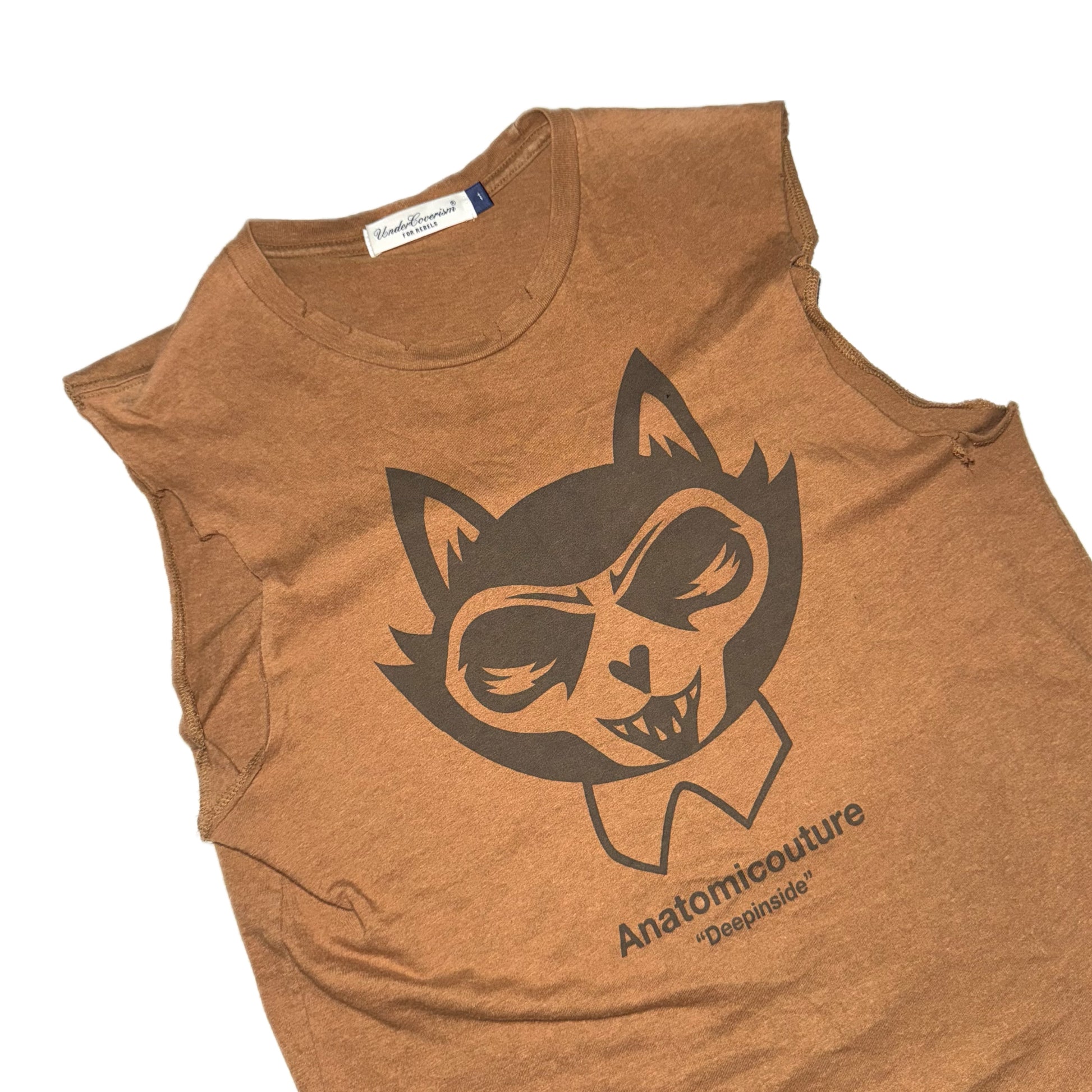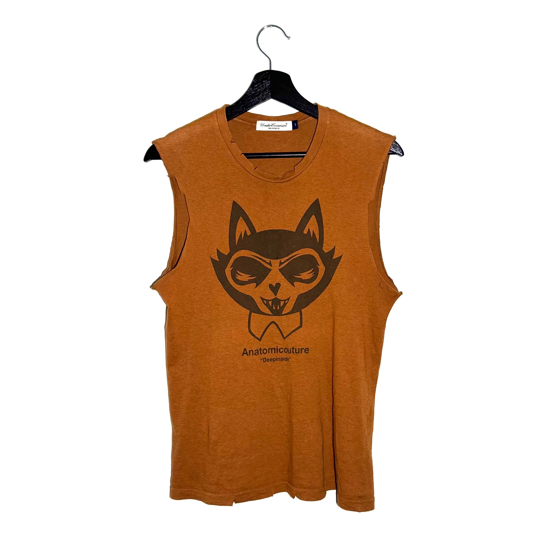 Cute shirt with a print featuring the Anatomicouture cat with fangs and heart-shaped nose. Originally a T-shirt, altered into a tank-top.