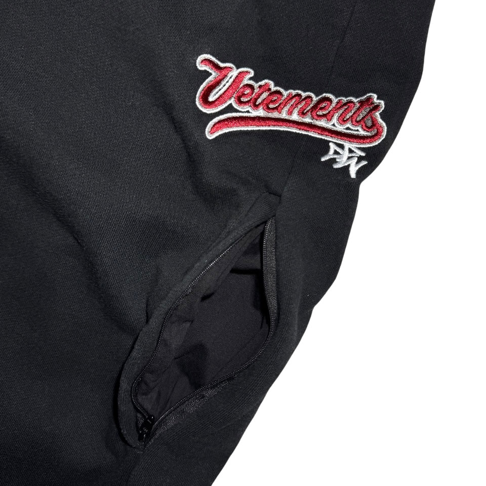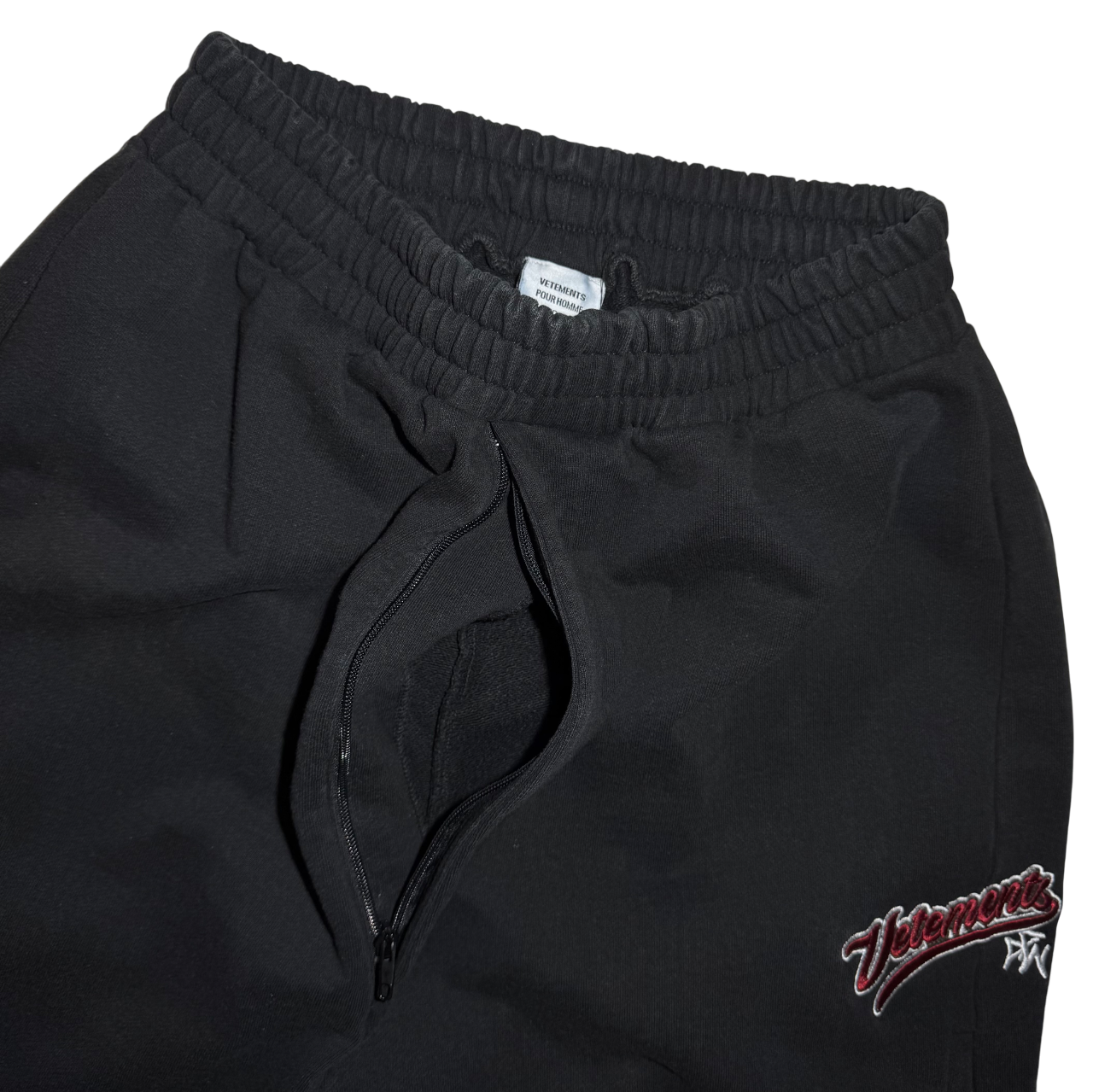 Arguably the rarest sweatpants from Demna's era at Vetements. These super oversized baggy relaxed-fit French terry sweatpants in black features elastic waistband with drawstring, zip-fly and two hidden pockets with zipper closures in the mid-leg area as well a big singular back pocket.