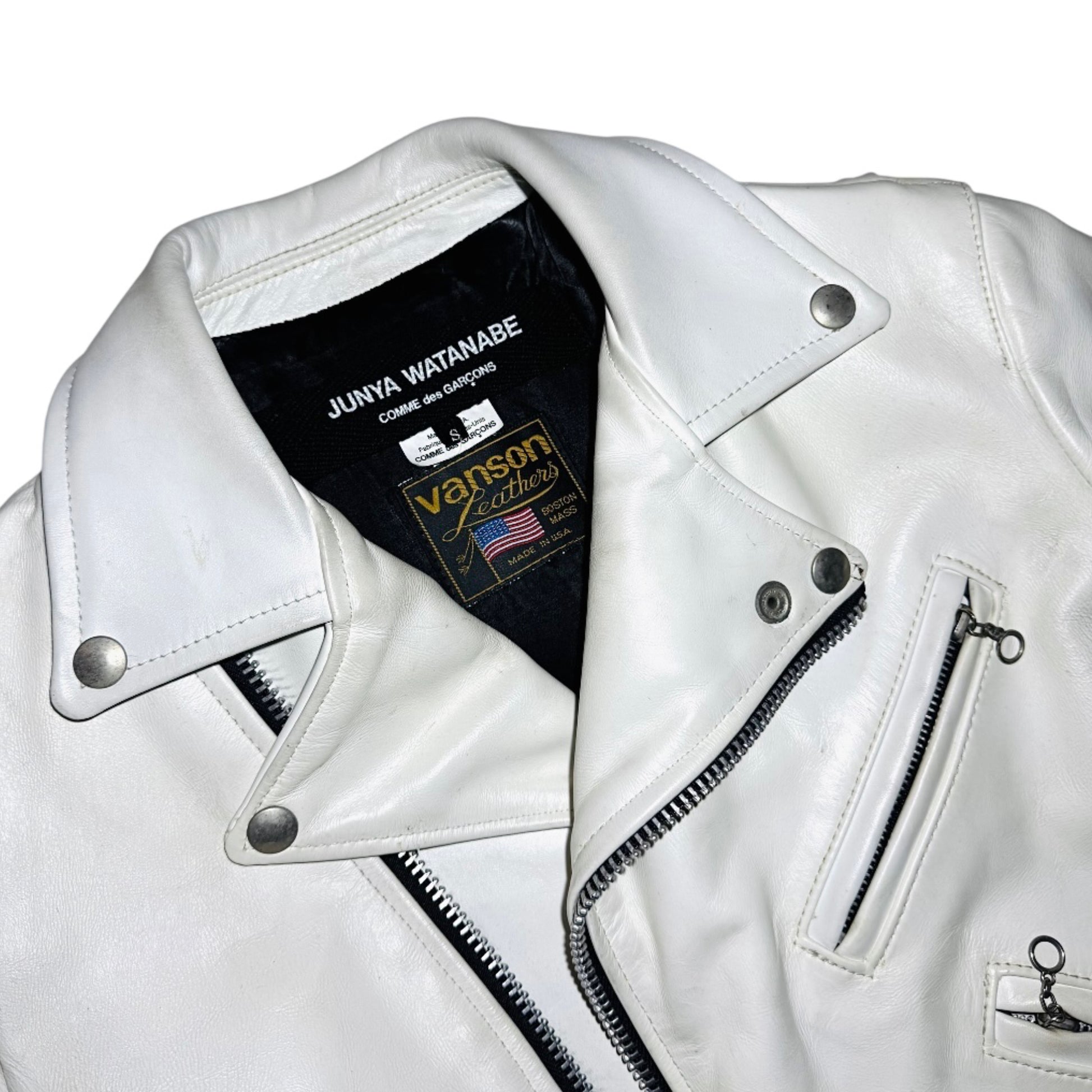 Beautiful runway piece from the autumn-winter 2007 collection. Produced in collaboration with Vanson Leathers, a label popular for their high-quality craftsmanship, especially in leather motorcycle jackets. The jacket is a mainline release, making it extremely hard to find (especially in white) since most of the Junya x Vanson collabs found online are sub-label releases such as Junya Watanabe MAN or MAN eYe.